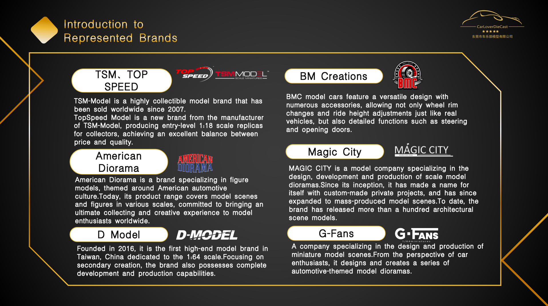 Since its establishment in 2016, the company has gradually secured distribution rights for leading domestic and international model brands. As of October 2024, CarLoverDieCast has become the exclusive distributor in China for 16 model brands.